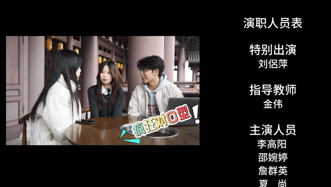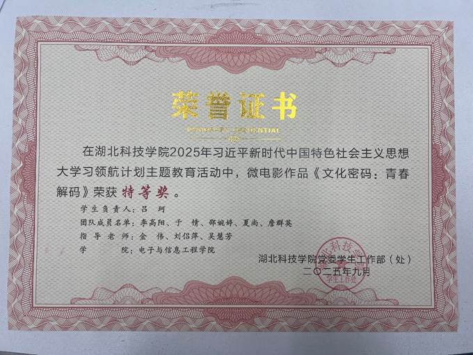 在微电影展示活动中,由吕珂同学担任学生负责人,李高阳、于情、邵婉婷、夏尚、詹群英等同学共同参与,金伟、刘侣萍、吴慧芳老师指导的作品《文化密码:青春解码》荣获特等奖,是本次活动中最高奖项的唯一获得者。该作品以微电影形式,生动展现了新时代青年对文化传承与时代精神的深刻理解,获得评审专家一致好评。