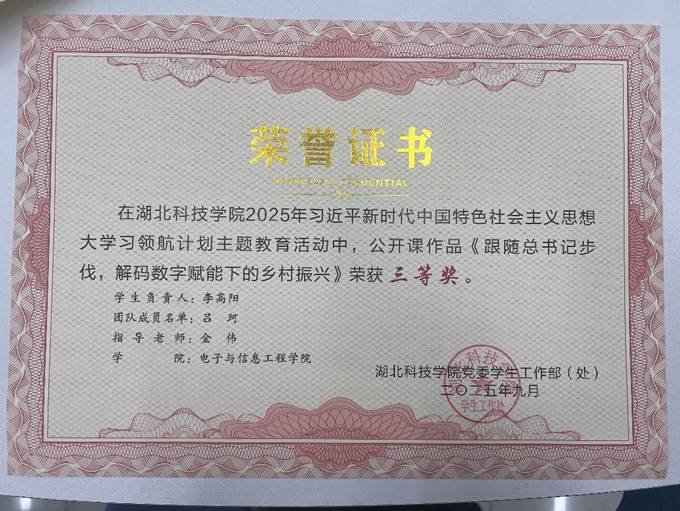 此外,在思政课公开课展示中,由李高阳同学负责,吕珂同学参与,金伟老师指导的公开课作品《跟随总书记步伐,解码数字赋能下的乡村振兴》荣获三等奖。该课程紧扣乡村振兴主题,结合数字技术发展,体现了学生将理论知识与社会实践相结合的探索精神。