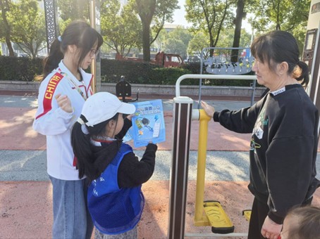 同一时间,人民广场活动组已完成会场布置,刘欣雨等学员有序引导金桂社区儿童服务站的小朋友签到、穿戴志愿马甲。9:15起,10组“青马学员+小小志愿者”搭档穿梭在广场中,开展活动预热宣传,吸引了大批市民驻足。